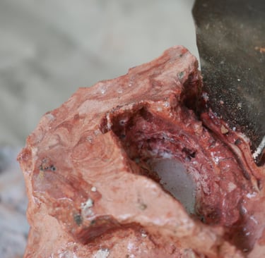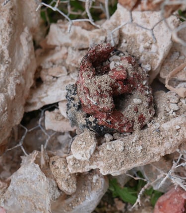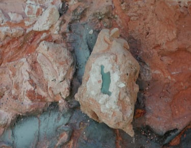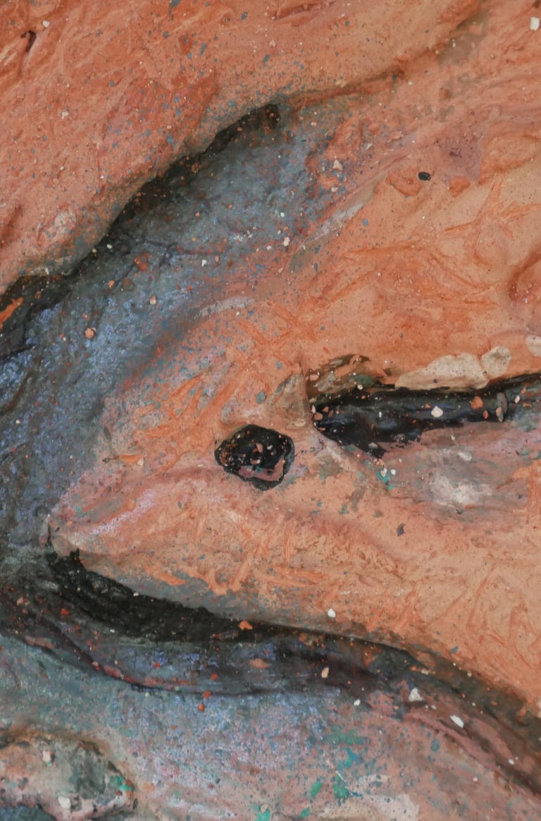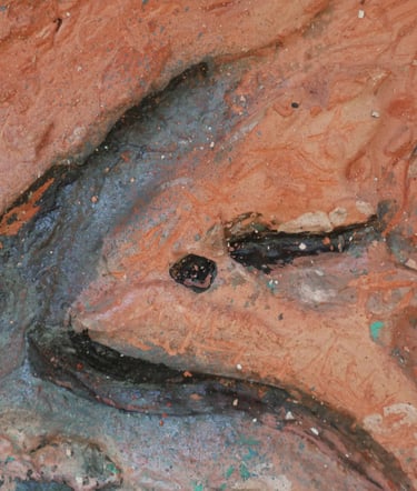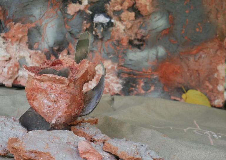 Zoom, Cœur carthographié, tableaux et sculpture, platre, terre, fragment de verre, 50 x 50 cm et 30 x 20 cm.