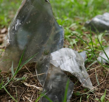 Zoom, vase explosé, impression typon de photographies familiales et verre, 40 fragments, 50 x 35 cm.